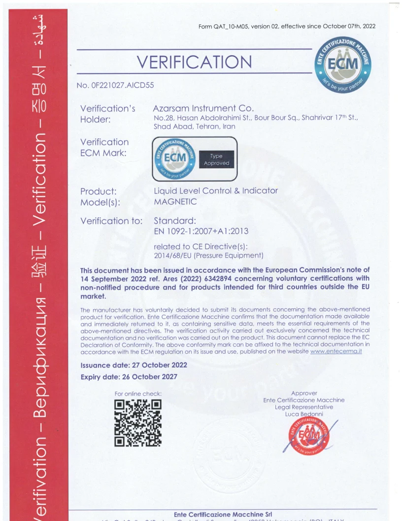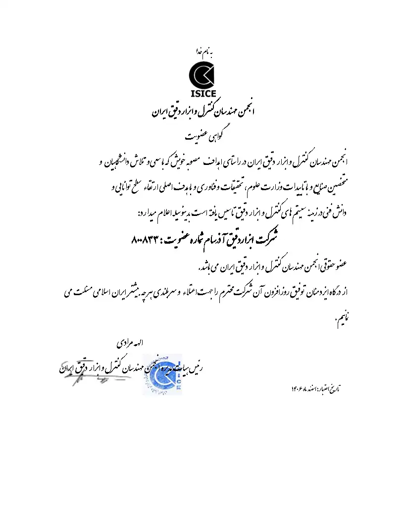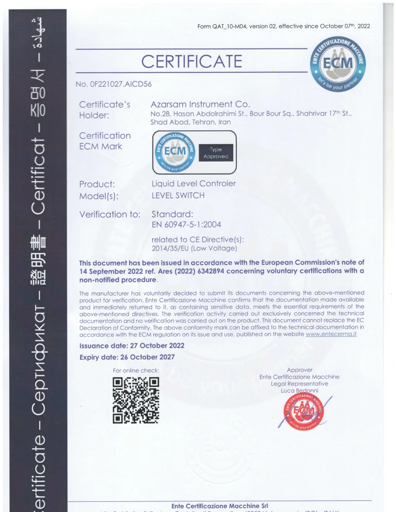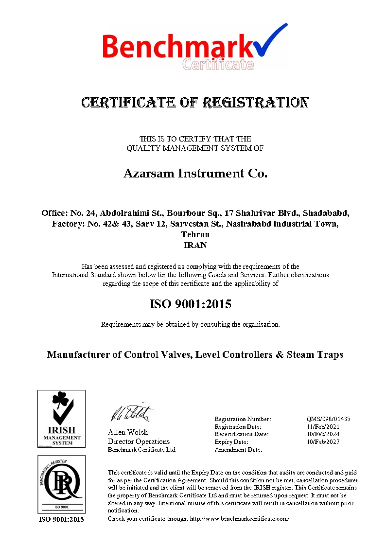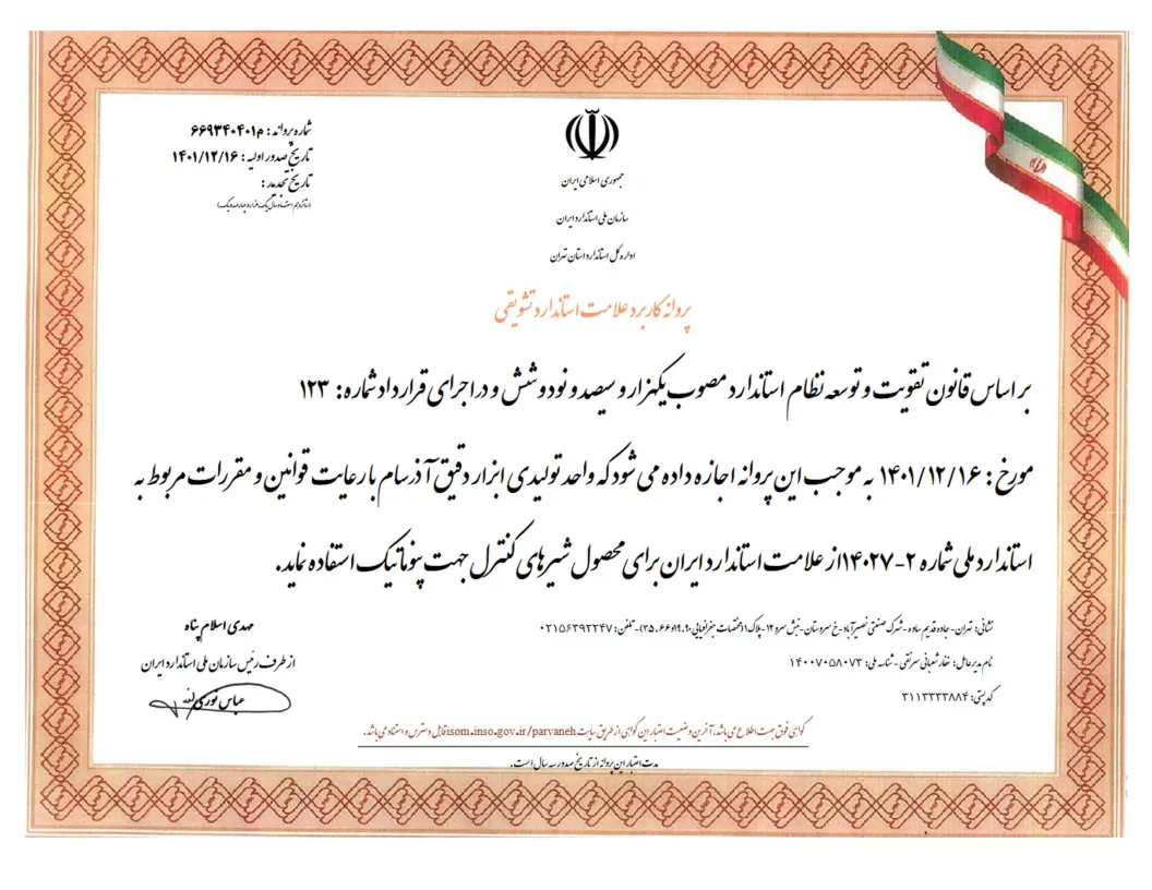 گواهینامه ها گواهی IEP Atex برای سنسور مغناطیسی MS15 گواهی ثبت علامت تجاری E.T.C شرکت ابزار دقیق آذرسام گواهی سیستم مدیریت کیفیت Iso 9001:2015 شرکت ابزار دقیق آذرسام استاندارد ملی برای شیر سوزنی - گلاب ولو - شیر کنترل دستی استاندارد ملی برای شیر پنوماتیک - شرکت ابزار دقیق آذرسام گواهی CE برای Liquid Level Control گواهی CE برای Mercury Level Switch لول سوئیچ جیوه ای عضویت در انجمن ها انجمن مهندسان کنترل و ابزار دقیق ایران انجمن سازندگان تجهیزات صنعت نفت ایران (استصنا) وندور لیست وندور لیست وندور لیست