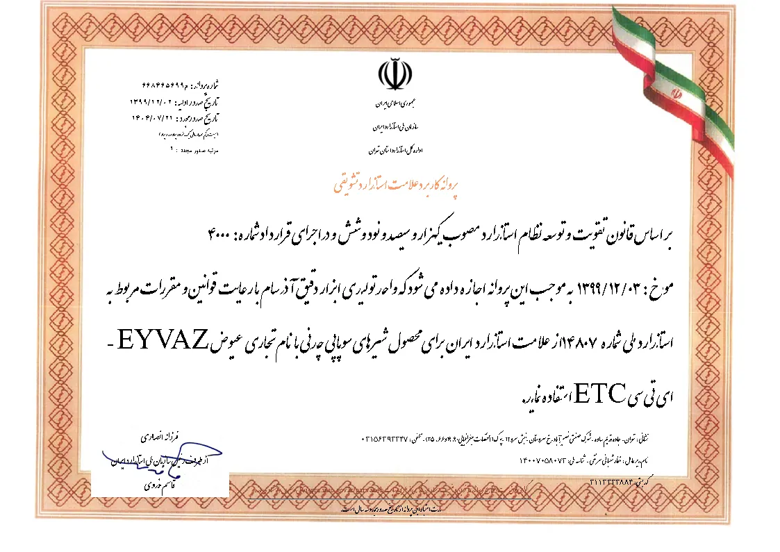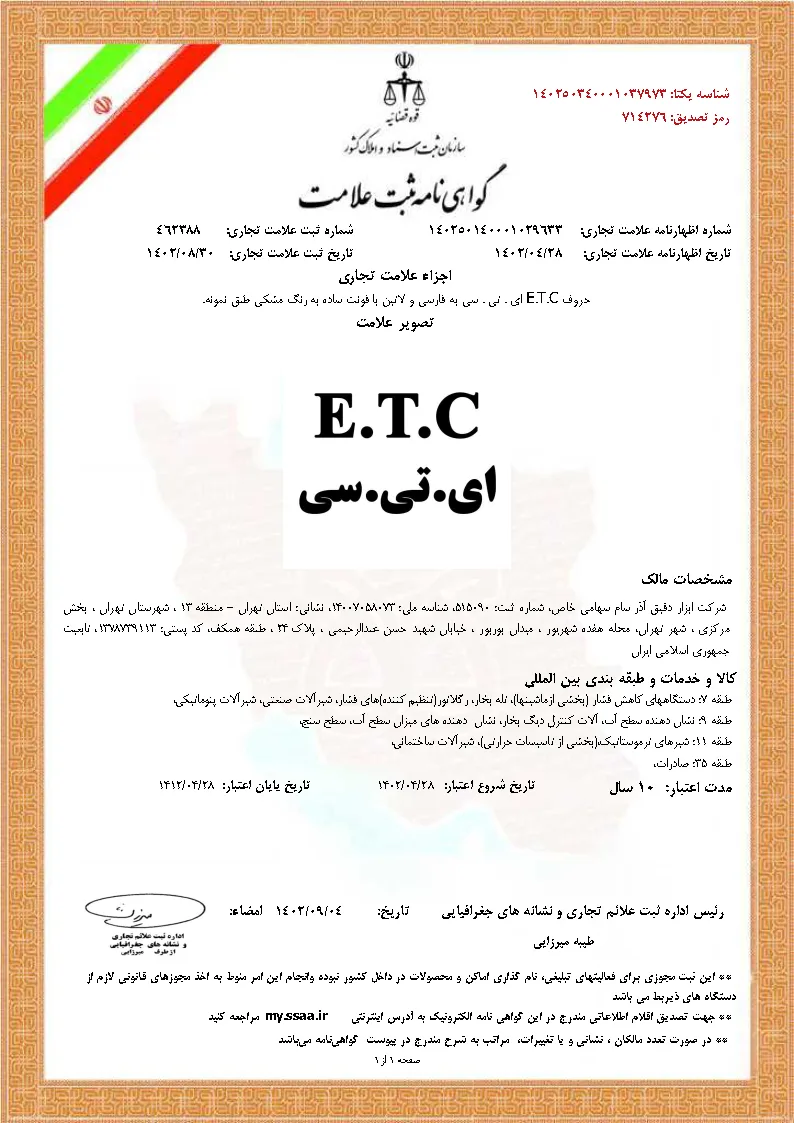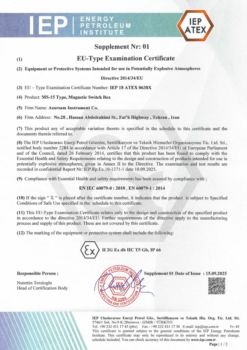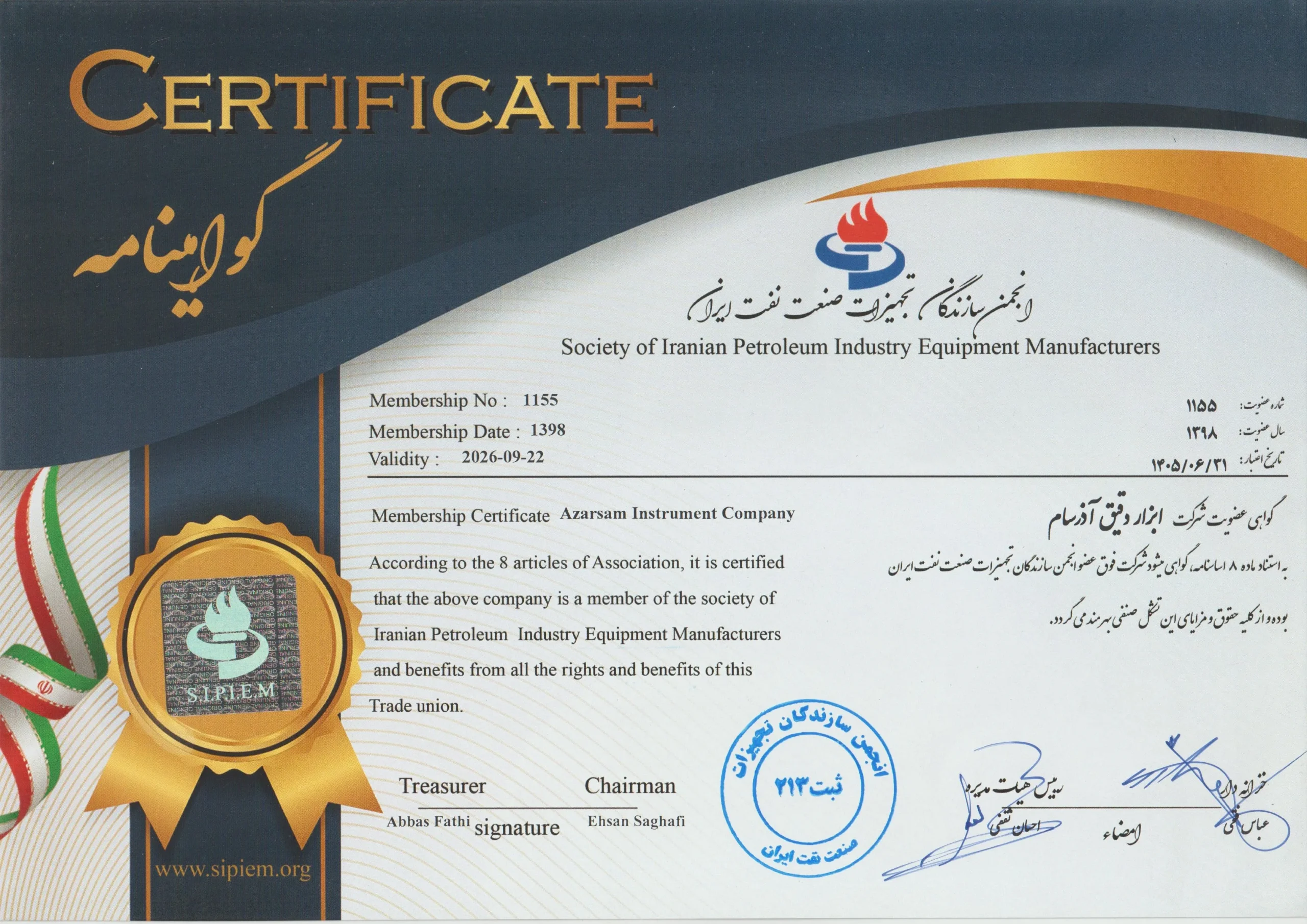 گواهینامه ها گواهی IEP Atex برای سنسور مغناطیسی MS15 گواهی ثبت علامت تجاری E.T.C شرکت ابزار دقیق آذرسام گواهی سیستم مدیریت کیفیت Iso 9001:2015 شرکت ابزار دقیق آذرسام استاندارد ملی برای شیر سوزنی - گلاب ولو - شیر کنترل دستی استاندارد ملی برای شیر پنوماتیک - شرکت ابزار دقیق آذرسام گواهی CE برای Liquid Level Control گواهی CE برای Mercury Level Switch لول سوئیچ جیوه ای عضویت در انجمن ها انجمن مهندسان کنترل و ابزار دقیق ایران انجمن سازندگان تجهیزات صنعت نفت ایران (استصنا) وندور لیست وندور لیست وندور لیست